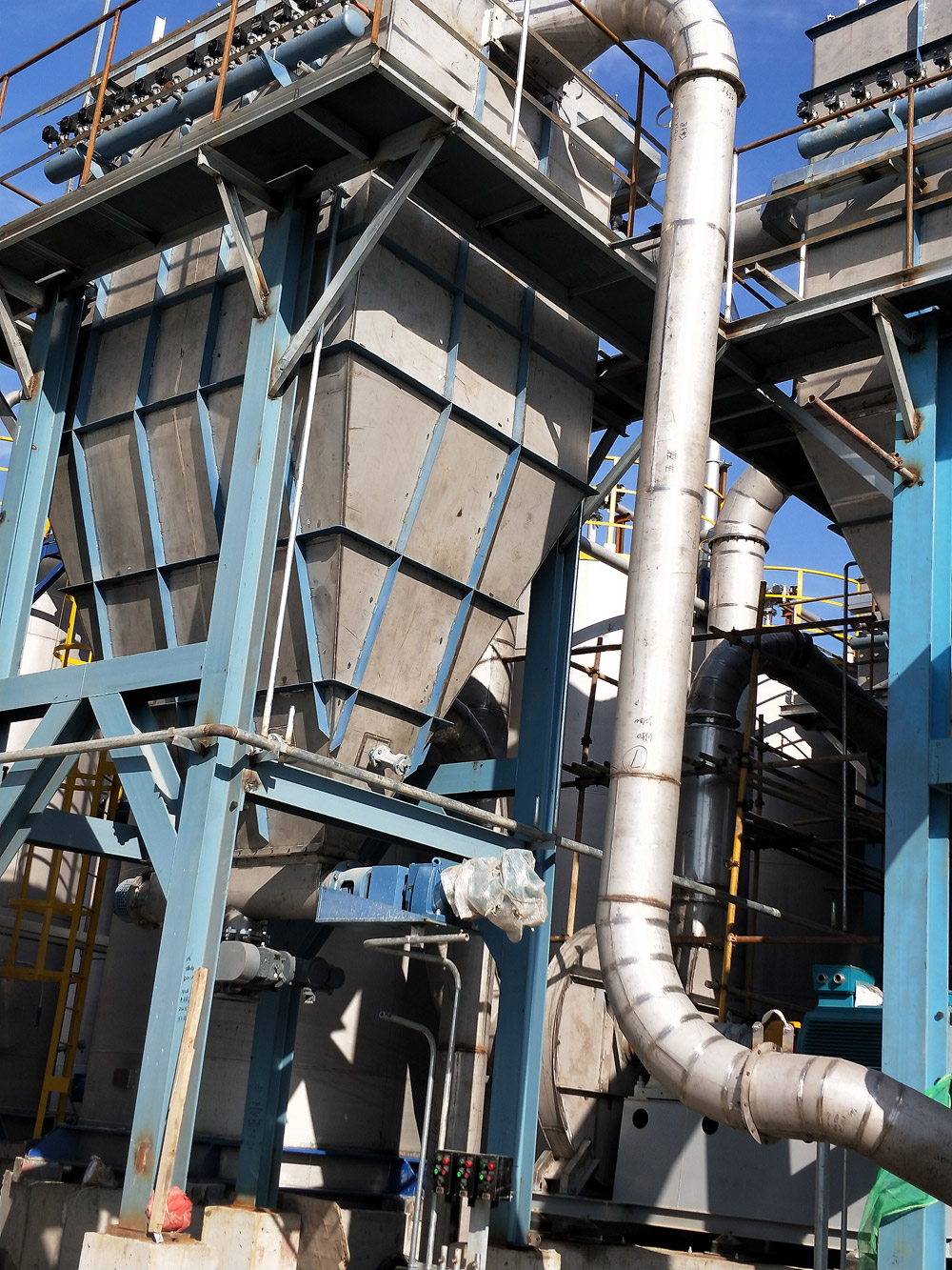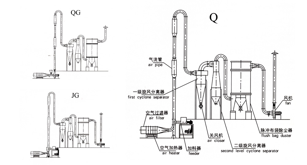 濕物料經(jīng)輸送機與加熱后的自然空氣同時進入干燥器,二者充分混和,由于熱質(zhì)交換面積大,從而在很短的時間內(nèi)達到蒸發(fā)干燥的目的。干燥后的成品從旋風(fēng)分離器排出,一小部飛粉由旋風(fēng)除塵器或布袋除塵器得到回收利用。Q型氣流干燥器是負壓操作,物料不經(jīng)過風(fēng)機;QG型氣流干燥器是正壓操作;物料經(jīng)過風(fēng)機帶有粉碎作用;FG型氣流干燥器是尾氣循環(huán)型;JG型氣流干燥器是強化型氣流干燥器,其集閃蒸干燥與氣流干燥為一體,是我公司根據(jù)用戶要求設(shè)計的新型干燥設(shè)備。