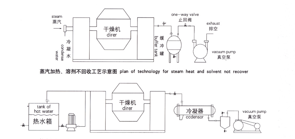 SZG雙錐回轉(zhuǎn)真空干燥機為雙錐形的回轉(zhuǎn)罐體,罐內(nèi)在真空狀態(tài)下,向夾套內(nèi)通入蒸汽和熱水進行加熱,熱量通過罐體內(nèi)壁與濕物料接觸。濕物料吸熱后蒸發(fā)的水汽,通過真空泵經(jīng)真空排氣管被抽走。由于罐體內(nèi)處于真空狀態(tài),且罐體的回轉(zhuǎn)使物料不斷的上下,內(nèi)外翻動,故加快了物料的干燥速度,提高干燥效率,達到均勻干燥的目的。