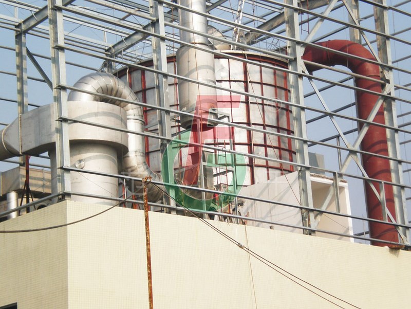 1.塔徑塔高作了相應的調(diào)整,既保證粉料干燥之前達不到塔壁,又可保證粉料的熱風停留時間而完成低溫干燥;塔壁設(shè)有夾套冷風冷卻裝置,確保料液不會粘結(jié)在塔壁上因局部溫度過高而產(chǎn)生軟化、熔融甚至焦化現(xiàn)象;錐度增大,錐體上安裝空氣震擊器,用壓縮空氣脈沖式地震擊筒體,把吸附在筒體上的粉料順暢地擊落下來。