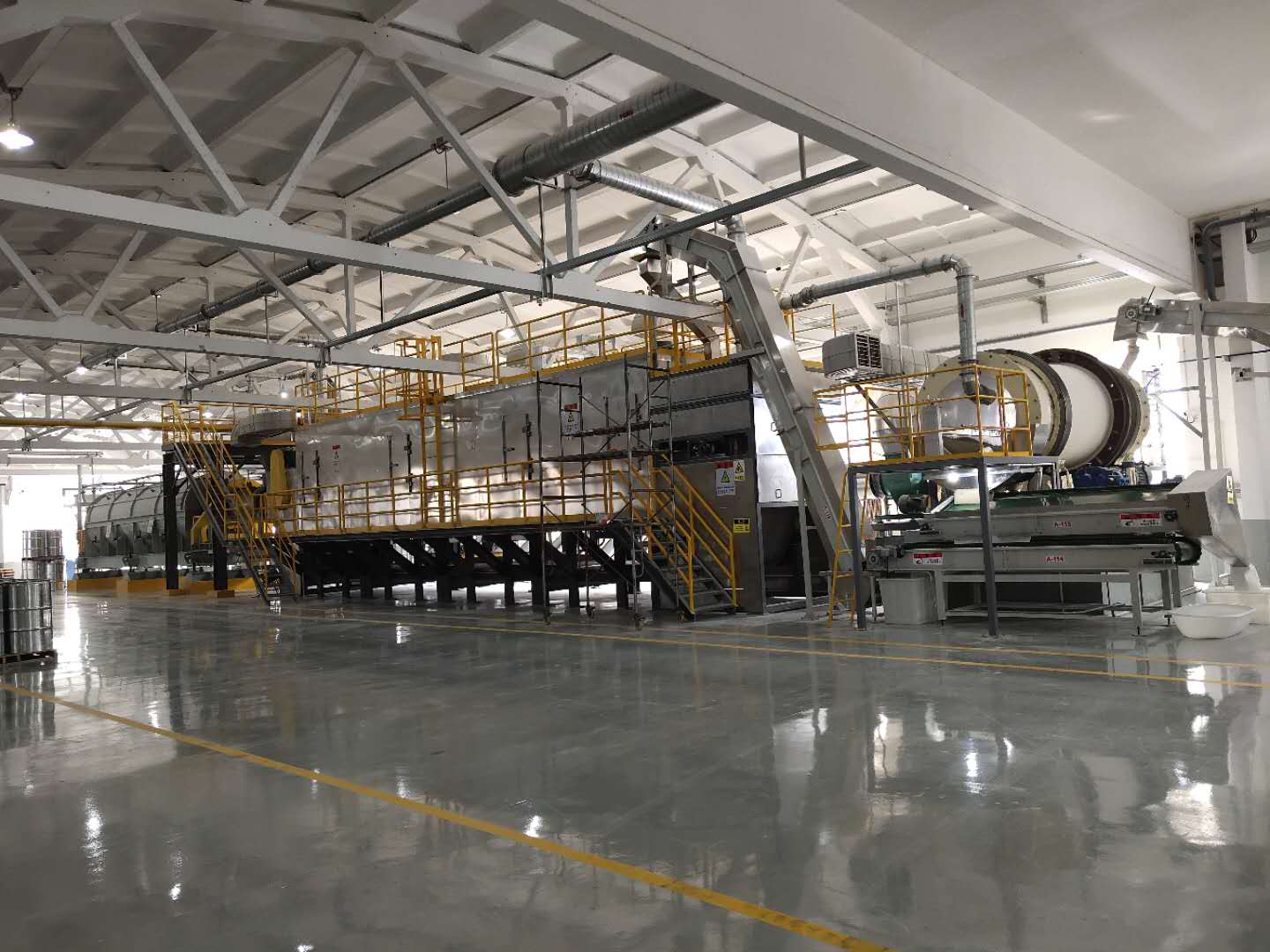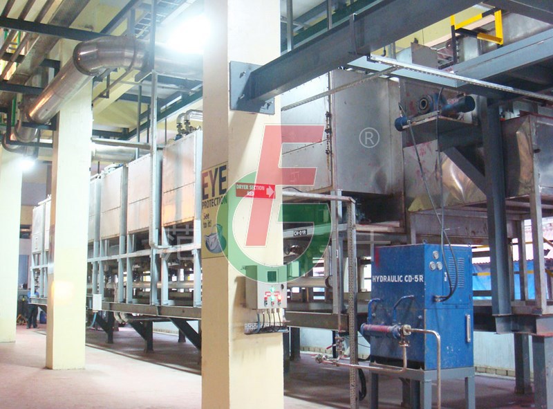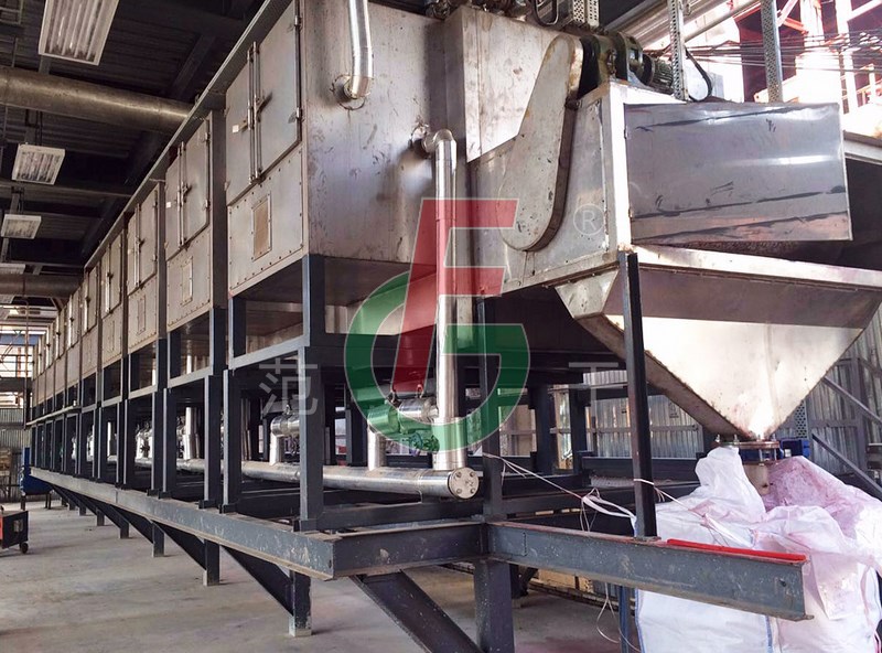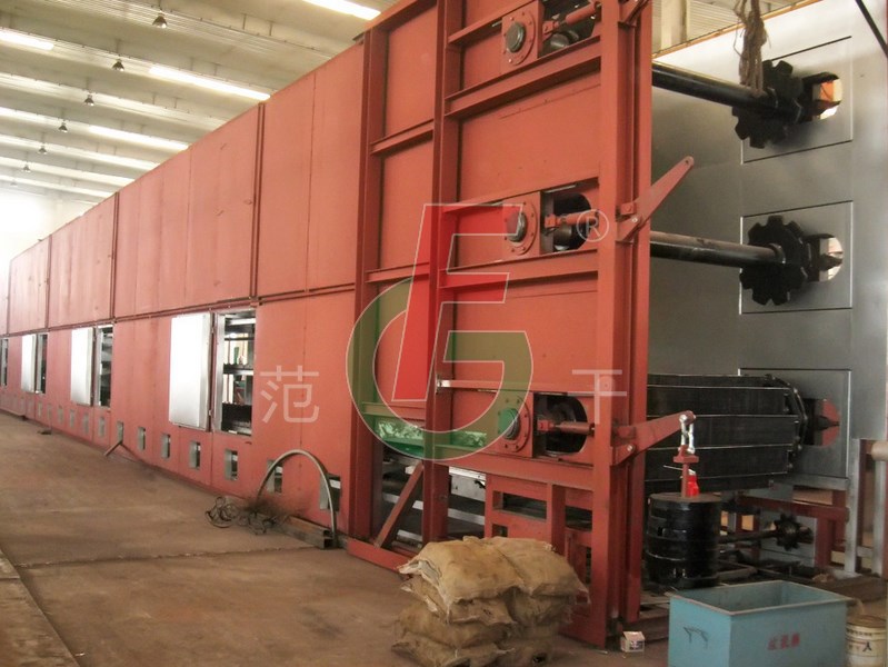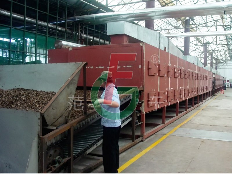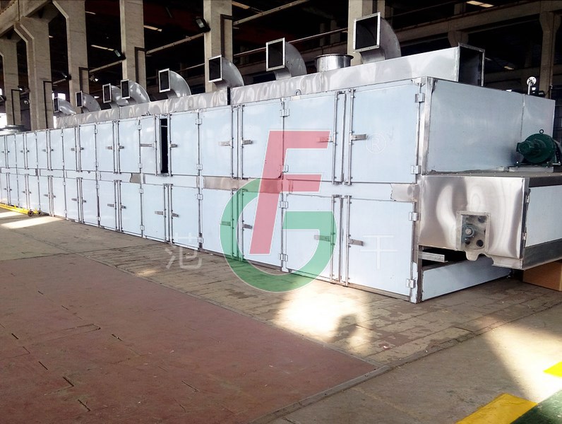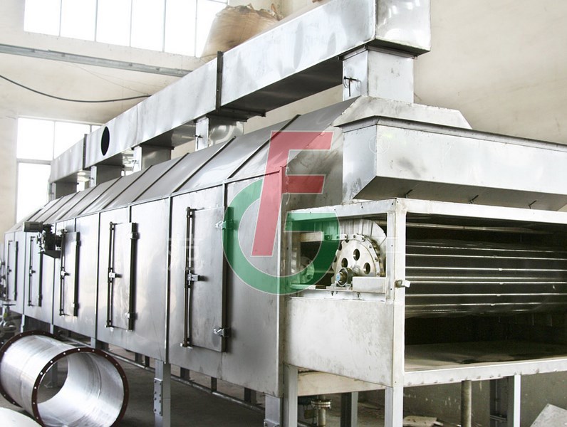 將需要處理的物料通過適當(dāng)?shù)牟剂蠙C(jī)構(gòu),如星型布料機(jī)、擺動(dòng)帶、粉碎機(jī)或造粒機(jī),分布在輸送帶上,輸送帶通過一個(gè)或幾個(gè)加熱單元組成的通道,每個(gè)加熱單元均配有空氣加熱和循環(huán)系統(tǒng),每一個(gè)通道有一個(gè)或幾個(gè)排濕系統(tǒng),在輸送帶通過時(shí),熱空氣從上往下或從下往上通過輸送帶上的物料,從而使物料能均勻干燥。
