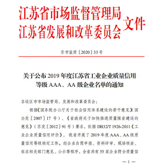 我司榮獲2019年度工業(yè)企業(yè)質(zhì)量信用等級(jí)AAA級(jí)企業(yè)榮譽(yù)