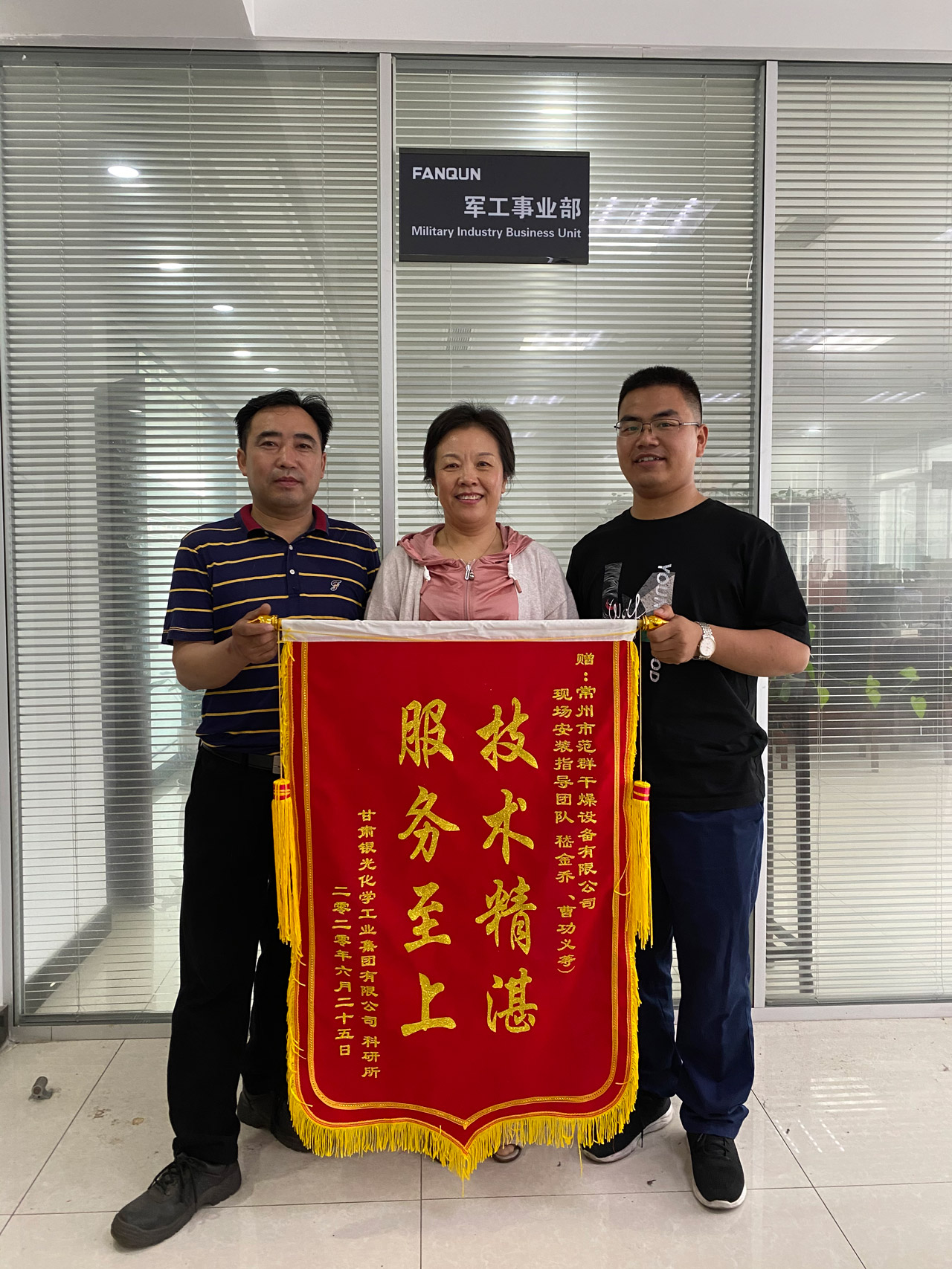 3月 26日,常州范群派出以嵇金喬為主的現(xiàn)場安裝指導團隊,該團隊秉承“服務(wù)于用戶,創(chuàng)精品工程”的理念,他們克服了高原反應(yīng),水土不服的生理不適;克服了疫情導致工期延誤的影響;克服了項目指導安裝中所遇到的各種困難,不屈不撓、加班加點、通宵作業(yè)、確保項目按時完工并通過驗收。常州范群這種全心全意服務(wù)于客戶的態(tài)度、吃苦耐勞打硬仗的精神,也獲得用戶的高度認可。為此,甘肅銀光化學工業(yè)集團有限公司科研所特別為常州范群現(xiàn)場指導安裝團隊頒發(fā)了“技術(shù)精湛 服務(wù)至上”的錦旗。他們用自己的不懈努力為常州范群、為自己贏得了榮譽。