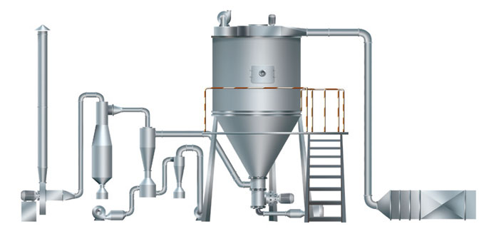 空氣經(jīng)過濾和加熱,進(jìn)入干燥器頂部空氣分配器,熱空氣呈螺旋狀均勻地進(jìn)入干燥室。料液經(jīng)塔體頂部的高速離心霧化器,(旋轉(zhuǎn))噴霧成極細(xì)微的霧狀液珠,與熱空氣并流接觸在極短的時間內(nèi)可干燥為成品。成品連續(xù)地由干燥塔底部和旋風(fēng)分離器中輸出,廢氣由引風(fēng)機(jī)排空。