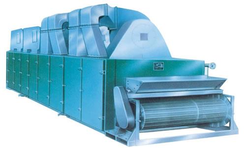 物料由加料器均勻地鋪在網(wǎng)帶上,網(wǎng)帶一般采用12-60目不銹鋼絲網(wǎng),由傳動(dòng)裝置拖動(dòng)在干燥機(jī)內(nèi)移動(dòng)。干燥機(jī)由若干單元組成,每一單元熱風(fēng)獨(dú)立循環(huán),部分尾氣由專門(mén)排濕風(fēng)機(jī)排出,廢氣由調(diào)節(jié)閥控制,熱氣由下往上或由上往下穿過(guò)鋪滿物料的網(wǎng)帶完成熱量與質(zhì)量傳遞的進(jìn)程,帶走物料水份。網(wǎng)帶緩慢移動(dòng),運(yùn)行速度可根據(jù)物料溫度自由調(diào)節(jié),干燥后的成品連續(xù)落入收料器中。上下循環(huán)單元根據(jù)用戶需要可靈活配備,單元數(shù)量亦可根據(jù)需要選取。